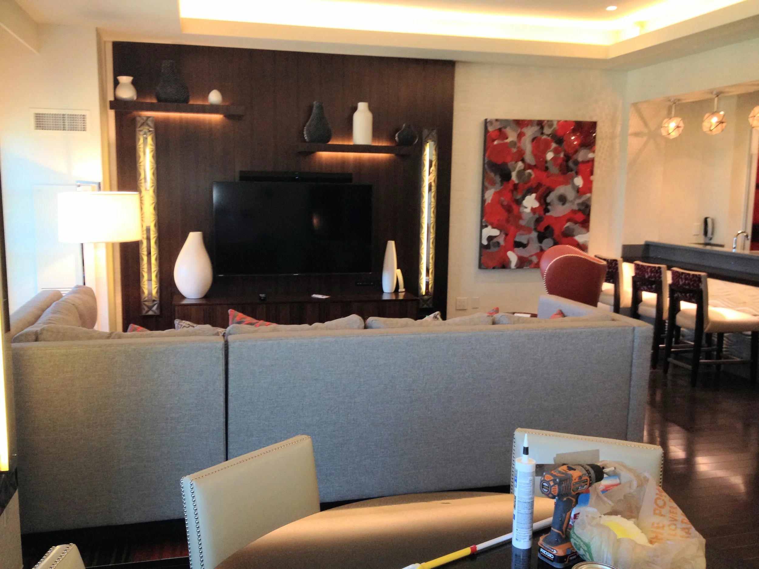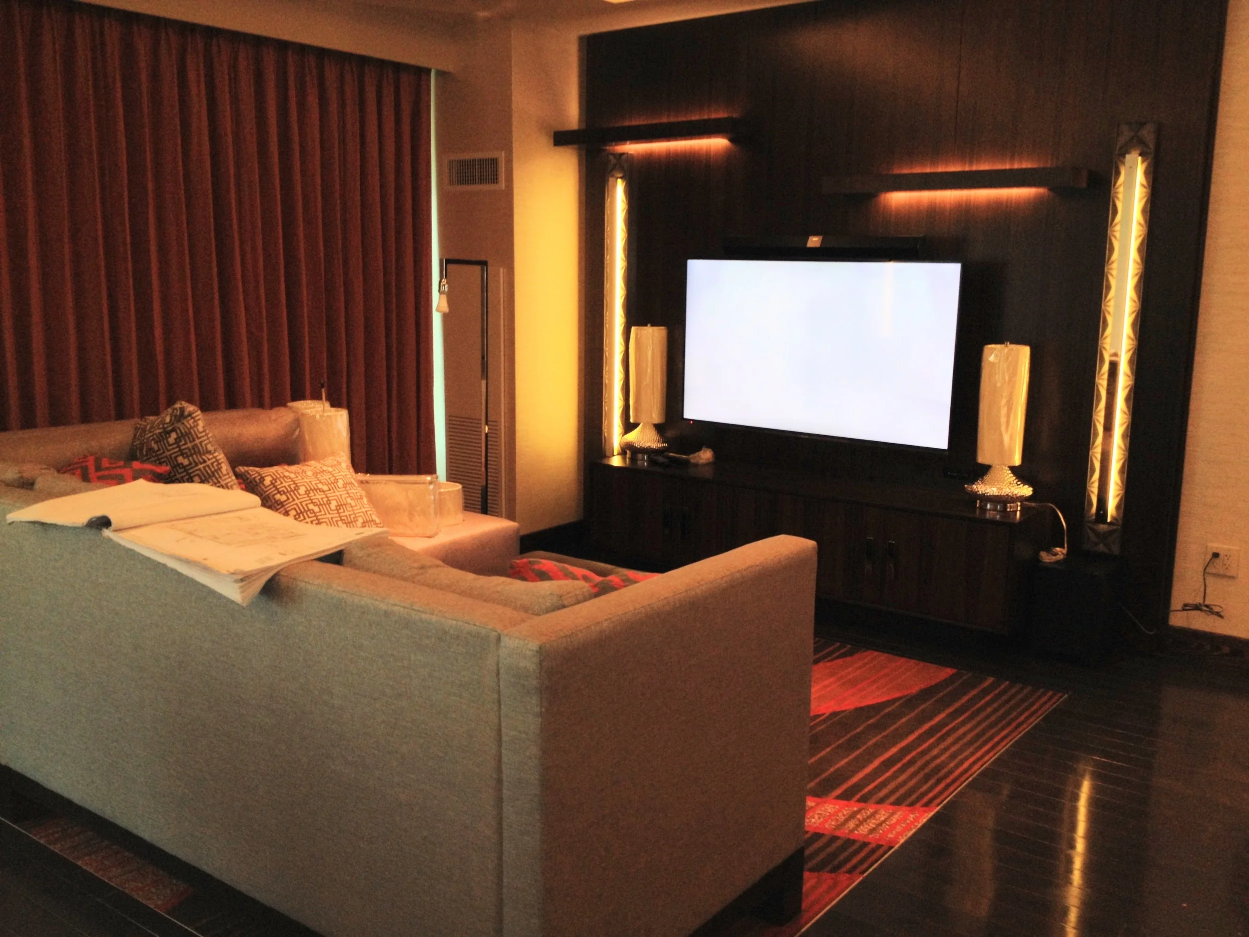 Working with my partner Joe osceola jr (pictured Below), an elder of the Seminole tribe of florida (the owners of the hard rock hotels, casinos and cafe's world wide, We re-engineered the space when necessary, installed multi position mounts, configured the 32" $3000 mirror tv in master bathroom, the 42" wetbar, master bedroom 50" tv and the 65 incher in the living room of the roxy suites. some TVs were equipped with sony sound bars and subwoofer we also integrated bluetooth tech. others were mated with a wrap around amplified Stereo speaker system. most featured multi media hubs for connecting many types of tech gadgets. We also did similar upgrades to the fillmore, Apollo, savoy suites and guest rooms throughout 12 floors of the hotel. In a incredible short time, each of the hotel guest room floors were closed to the public on sunday then several trade crews completely took down the whole floor to the studs and rebuilt the rooms using all new materials, equipment and furnishings then readied them for check-in by guests the next saturday.